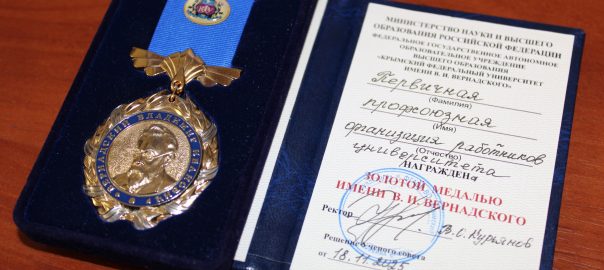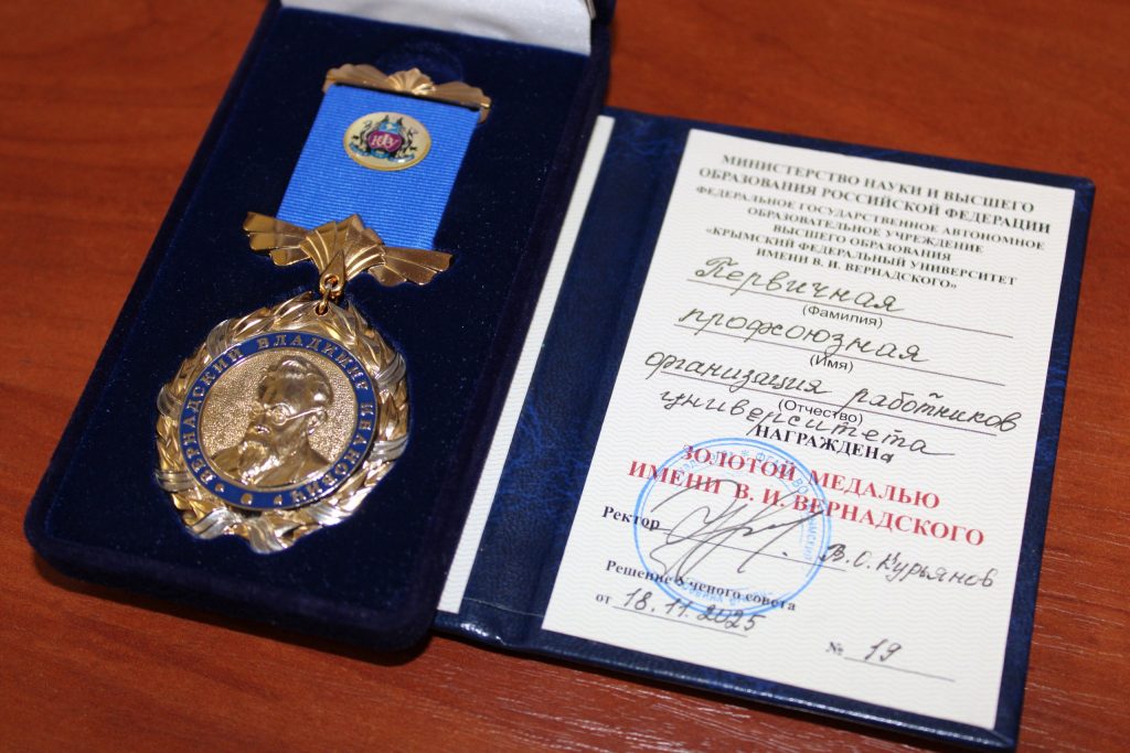 Золотая медаль имени В.И. Вернадского вручена Первичной профсоюзной организации работников Университета на Ученом совете Крымского федерального университета им. В. И. Вернадского 27 ноября 2025 года.