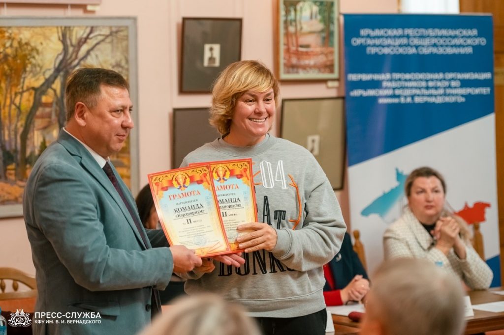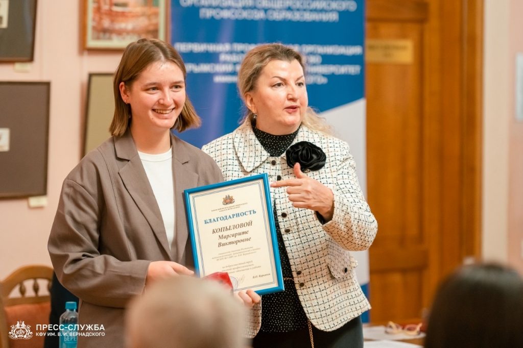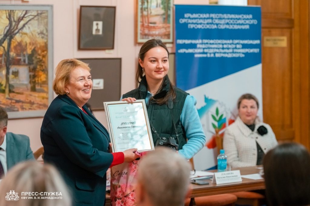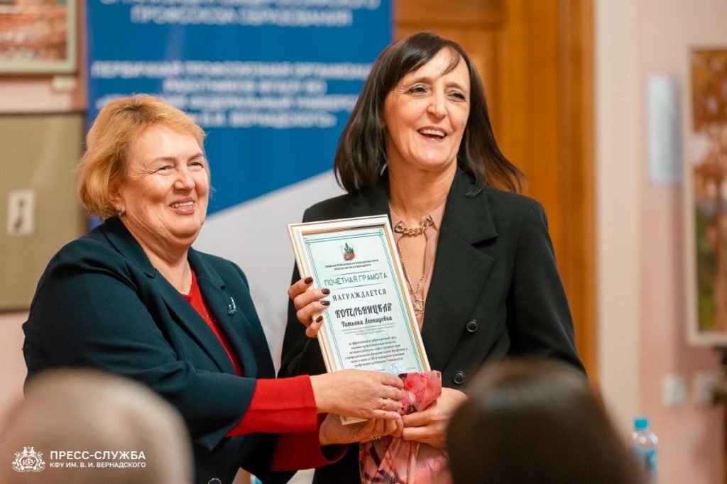 Награда присуждена в связи со 105-летием создания Профсоюзной организации в Университете — за её значительный вклад в развитие профсоюзного движения, активную гражданскую позицию, защиту социально-трудовых прав работников, а также за укрепление системы социального партнёрства в сфере высшего образования Республики Крым и Российской Федерации.