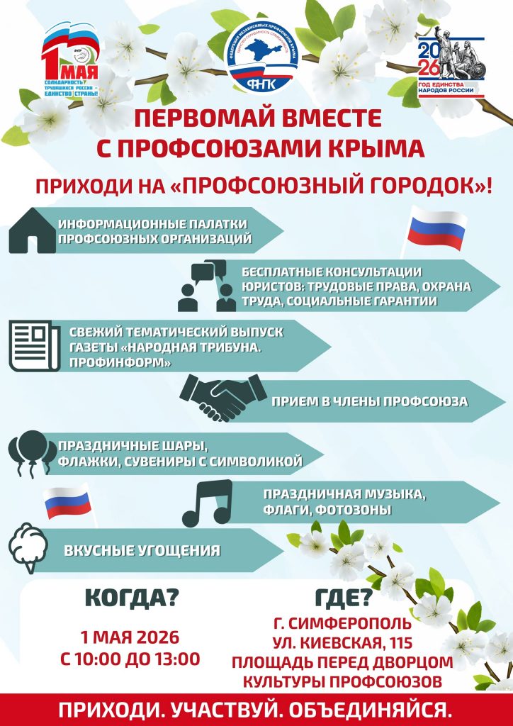 Давайте вместе сделаем 1 Мая ярким, полезным и запоминающимся! Где и когда: 1 мая 2026 года с 10:00 до 13:00 г. Симферополь, ул. Киевская, 115 (площадь перед Дворцом культуры профсоюзов) Вход – свободный ПРИГЛАСИ СВОИХ КОЛЛЕГ, ДРУЗЕЙ И СЕМЬЮ ПРОВЕСТИ ЭТОТ ДЕНЬ ВМЕСТЕ, ВЕДЬ 1 МАЯ – ЭТО НЕ ПРОСТО ВЫХОДНОЙ, А СИМВОЛ ЕДИНСТВА И СОЛИДАРНОСТИ ТРУДЯЩИХСЯ!