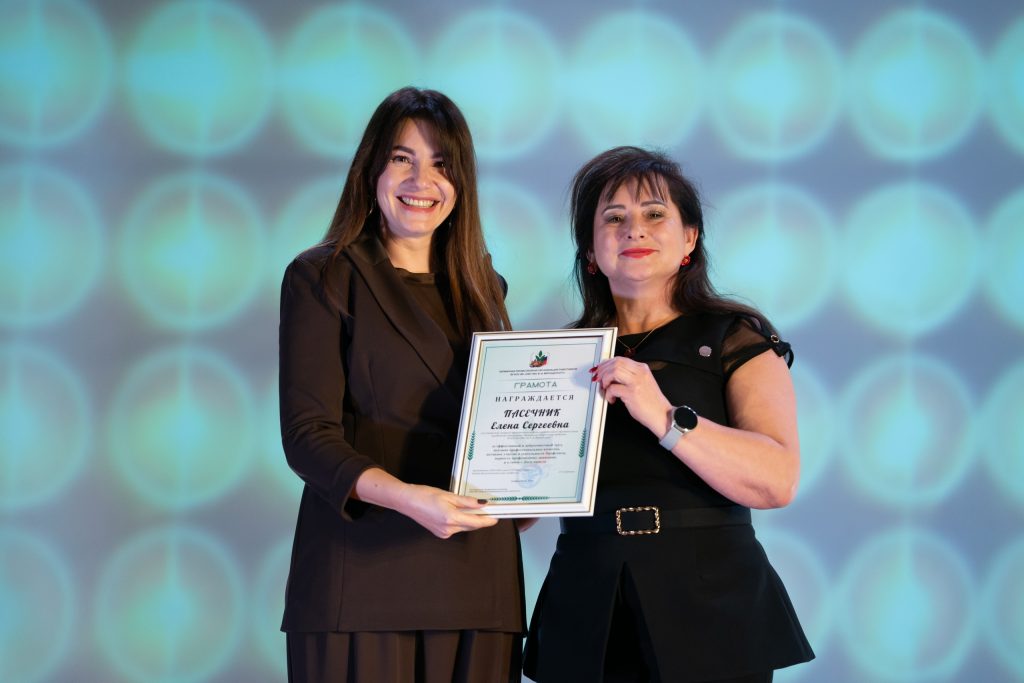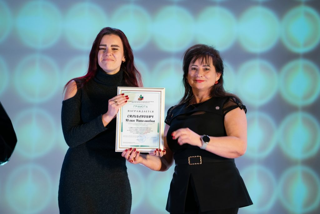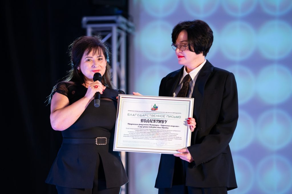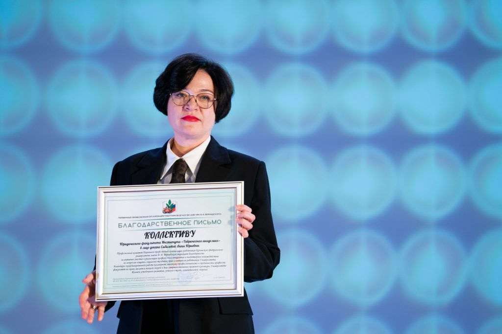 Председатель профсоюзной организации Университета Любовь Савченко вручает благодарственное письмо коллективу юридического факультета и награды профсоюзному активу юридического факультета.