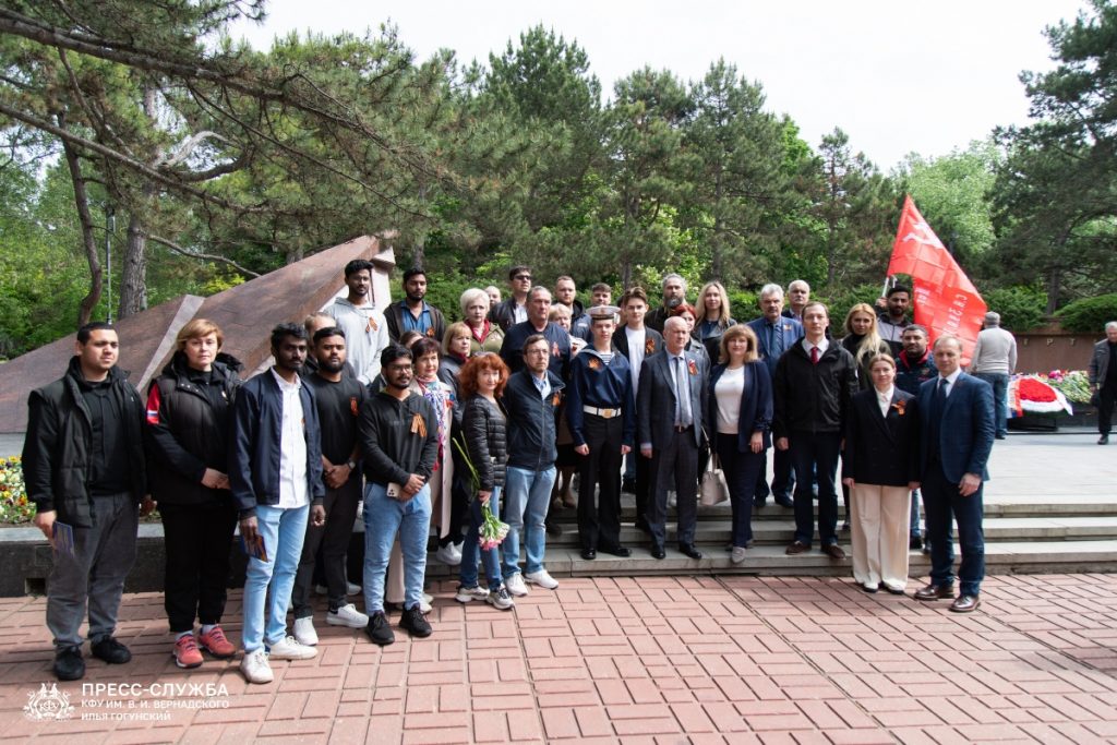 Фото 2. Н. А. Вовк вместе с и.о. ректора КФУ им. В. И. Вернадского В. О. Курьяновым и другими делегатами КФУ им В.И. Вернадского на возложении цветов у Вечного огня 9 мая 2025 года (верхний ряд, 5-ый справа).